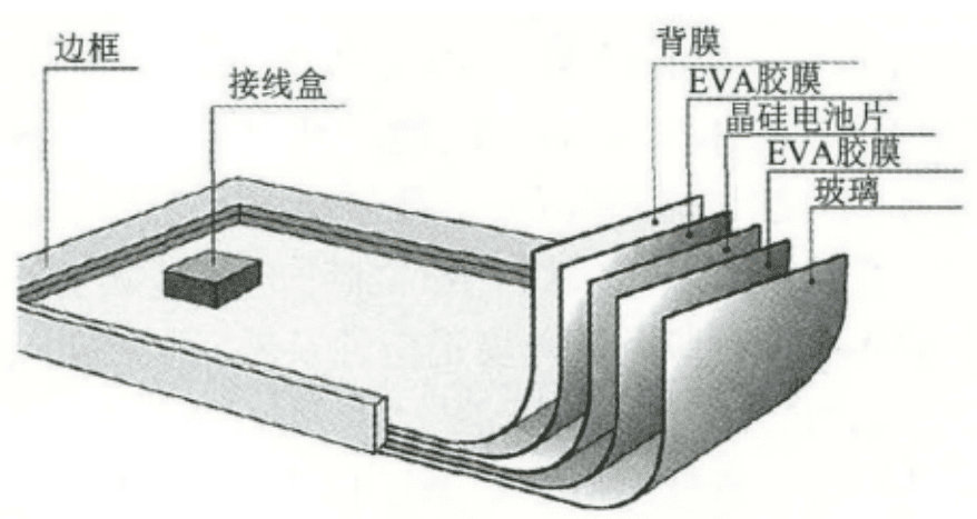 普通的光伏组件由上表面到背面依次为玻璃、EVA(上层)、电池片、EVA(下层)、TPT背板和铝合金边框等组成,如图1所示。